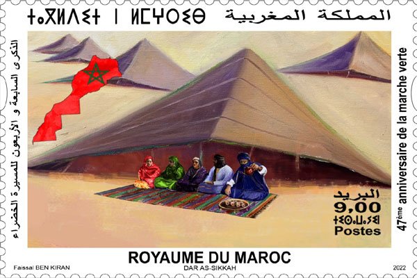 الرباط – أعلنت مجموعة بريد المغرب عن إصدار طابع بريدي خاص بمناسبة الذكرى السابعة والأربعين للمسيرة الخضراء المجيدة، يبرز أحد جوانب التراث اللامادي للأقاليم الجنوبية للمملكة.