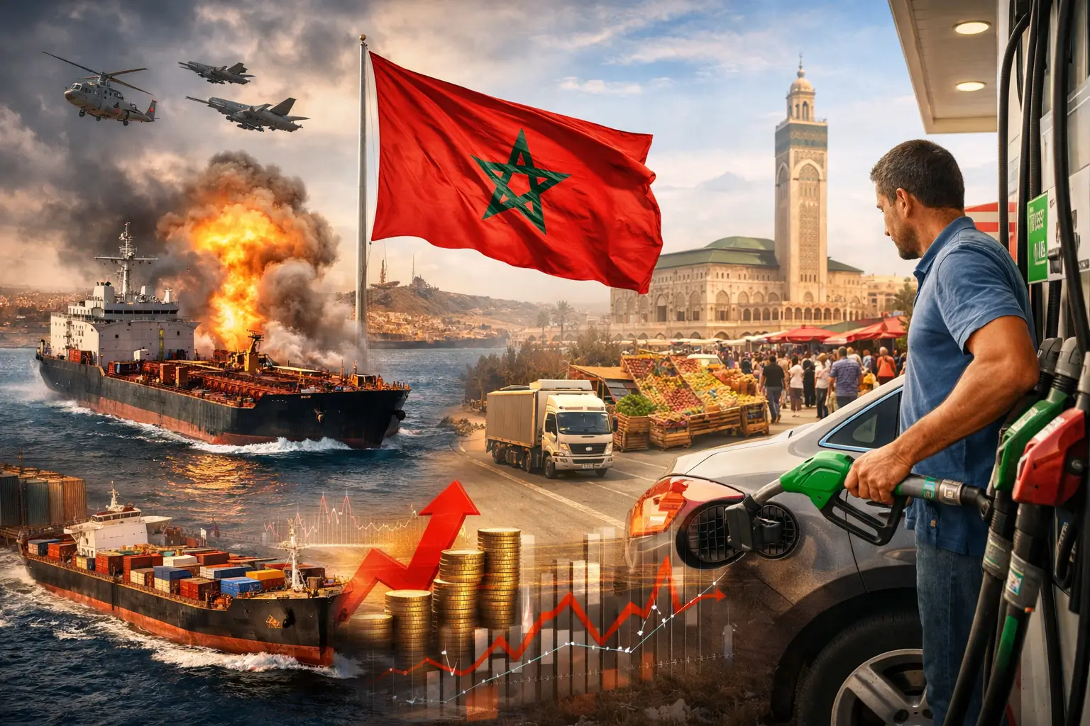 ويرسم التقرير سلسلة تأثير مترابطة تبدأ من مضيق هرمز، أحد أهم شرايين الطاقة في العالم، لتصل سريعاً إلى محطات الوقود بالمغرب، قبل أن تنعكس على أسعار الخضر والفواكه واللحوم والسمك، نتيجة ارتفاع كلفة النقل والتوزيع. وبذلك، تتحول المحروقات إلى عامل مركزي في موجة تضخمية متسلسلة تمس جميع القطاعات.
